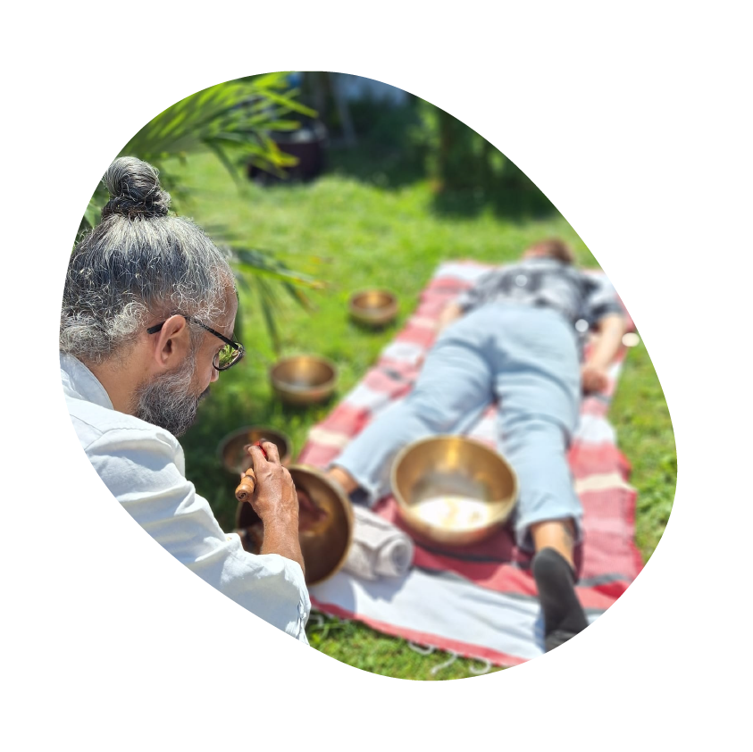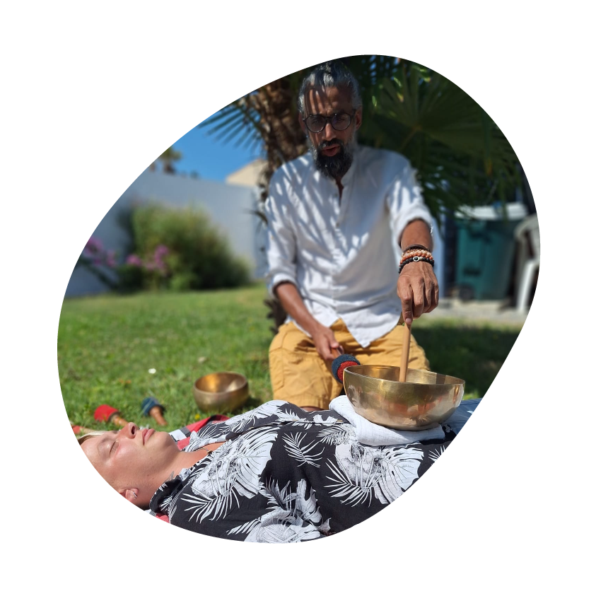Lors du massage sonore, les bols sont posés sur le corps puis délicatement mis en résonance.